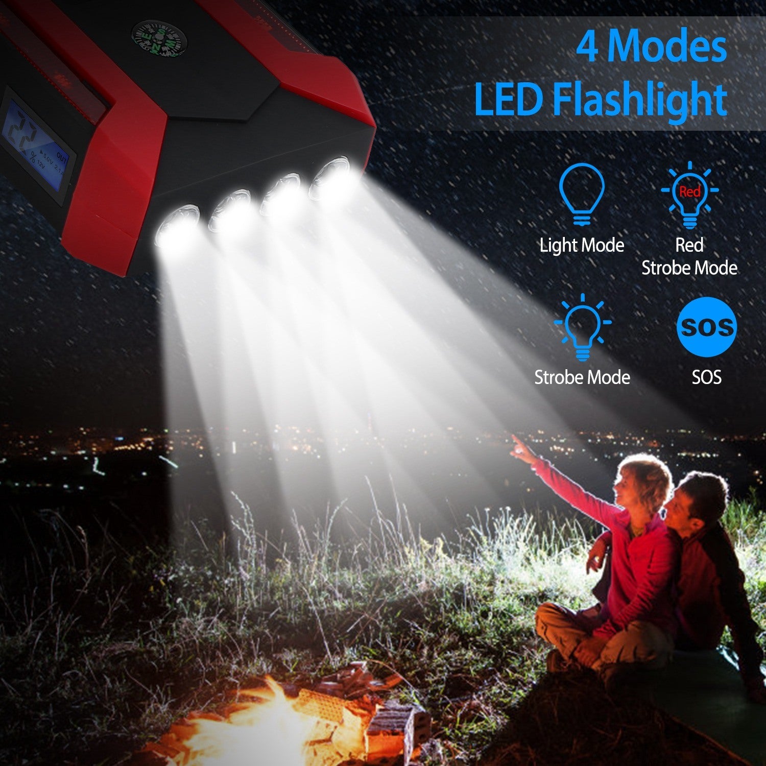 **USER FRIENDLY DESIGN*:Adopt LCD display screen,it can exactly show the remaining power of battery. There is a compass on this jump starter,if you get lost,it will help you a lot,which is a good choice for hiking,travel etc. Besides,the safety hammer on the side can also help in an emergency situation.
