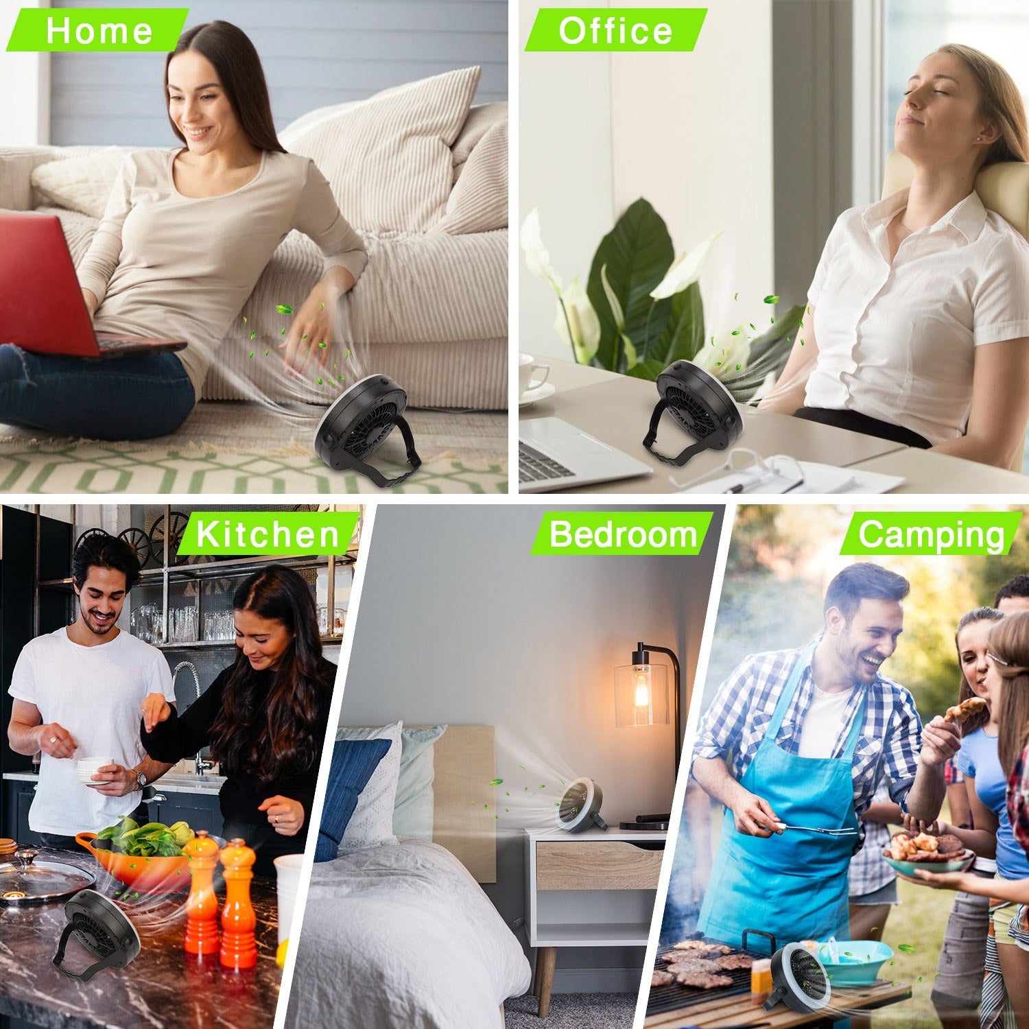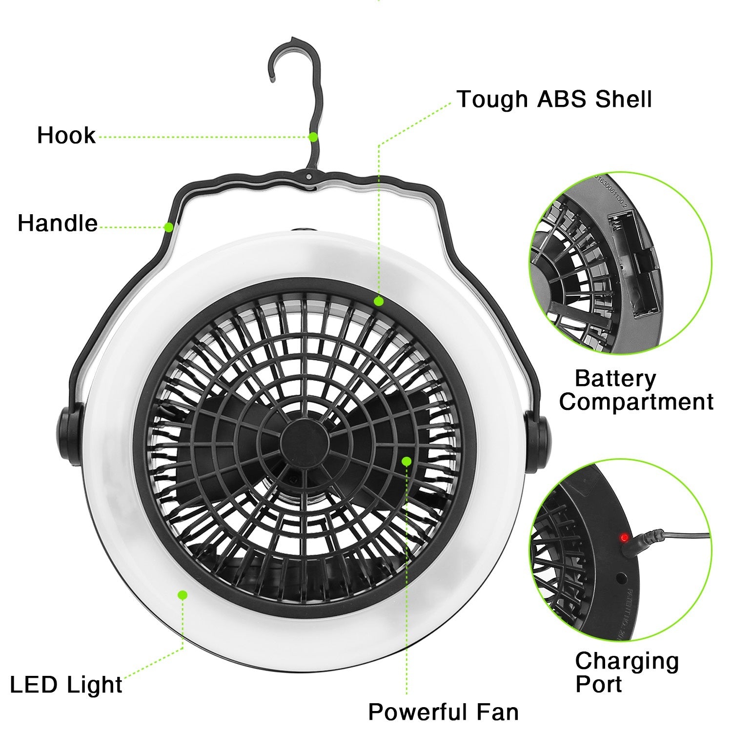 *[Camping Fan with LED Lights]- Combine tent fan and camping light functions. While bringing strong wind power,it can be quiet,energy-saving and stable for a long time. The head of this table fan is designed with a LED light for using in the tent at night. Wind power is adjustable horizontally/vertically by 360 degrees. Let you feel cool from every angle.
